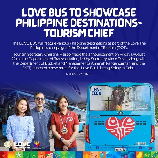 필리핀 관광부(DOT)가 ‘Love the Philippines’ 캠페인의 일환으로, 교통부(DOTr)·예산관리부(DBM)와 함께 세부에서 무료 대중교통 ‘러브 버스(Love Bus) 리브렝 사카이(Libreng Sakay)’ 2번째 노선을 8월 22일 공식 개통했다. 이날 크리스티나 가르시아 프라스코 관광부 장관과 빈스 디존 교통부 장관, 아메나 팡안다만 예산관리부 장관이 세부 시내에서 개통식을 공동 주재했다.