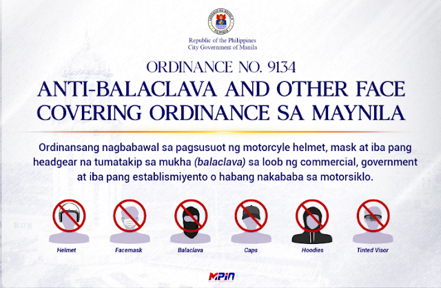 마닐라 공공정보사무소(PIO)에 따르면, 조례 제9134호는 상업 및 정부 시설 내부와 공공 장소에서 발라클라바, 비의료용 마스크, 얼굴을 가리는 후드티, 헬멧, 모자, 색이 칠해진 바이저의 사용을 금지합니다.