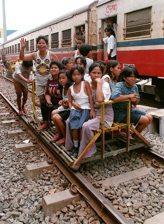 주민들은 필리핀 국영철도 선로를 따라 운행하는 즉석 나무 수레를 타고 짧은 여행을 즐깁니다. 이 수레는 열차(배경)가 지나갈 수 있도록 레일에서 쉽게 들어 올려 길을 비켜주는데, 이는 NSCR 건설을 위해 선로가 철거될 때까지 계속될 것입니다.
